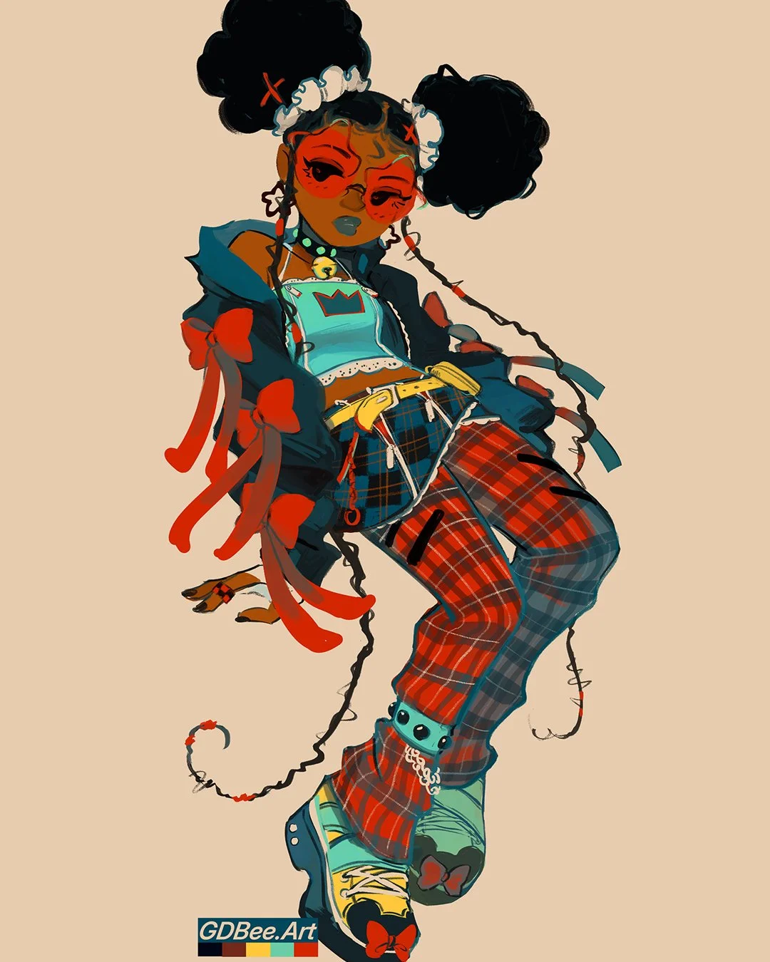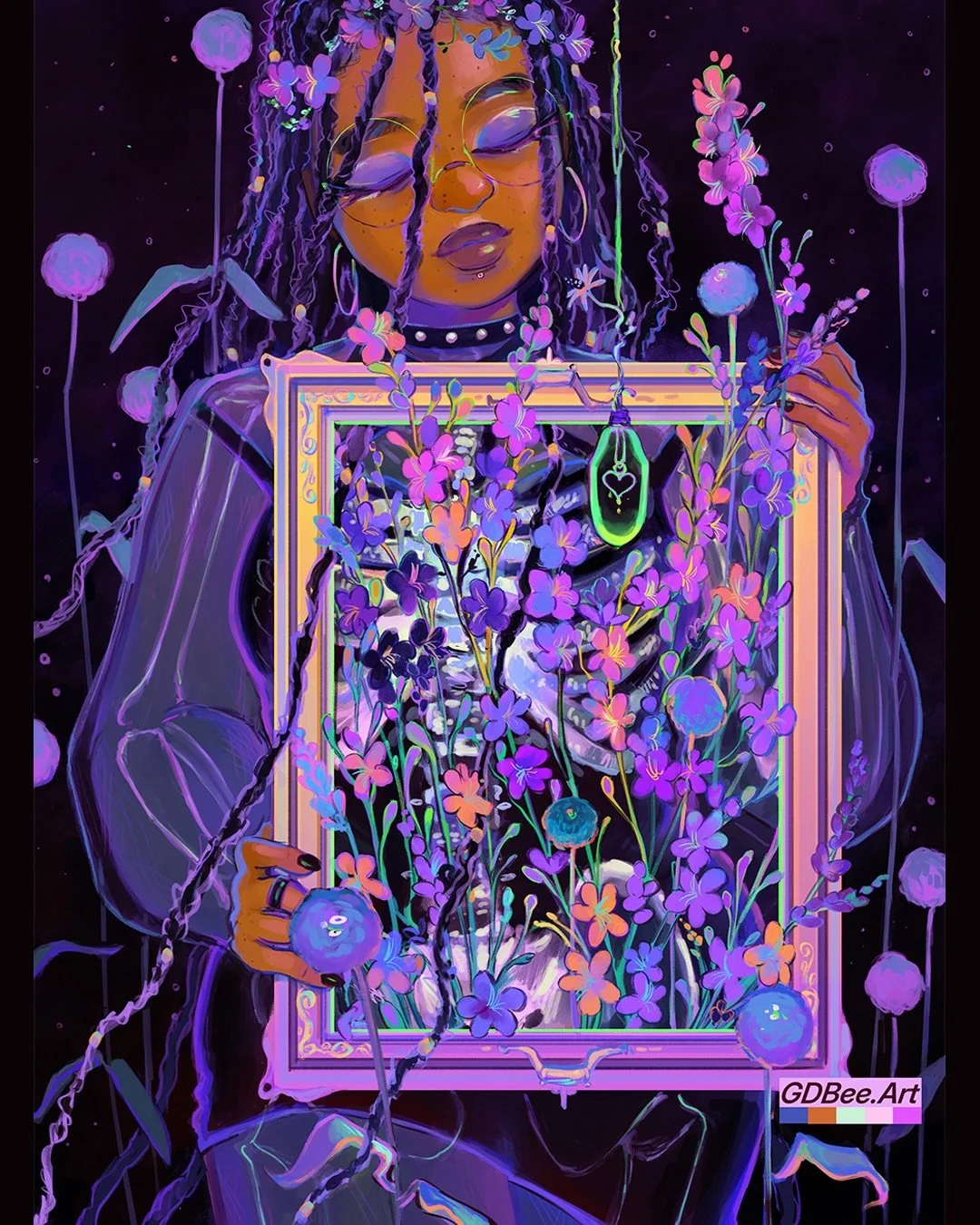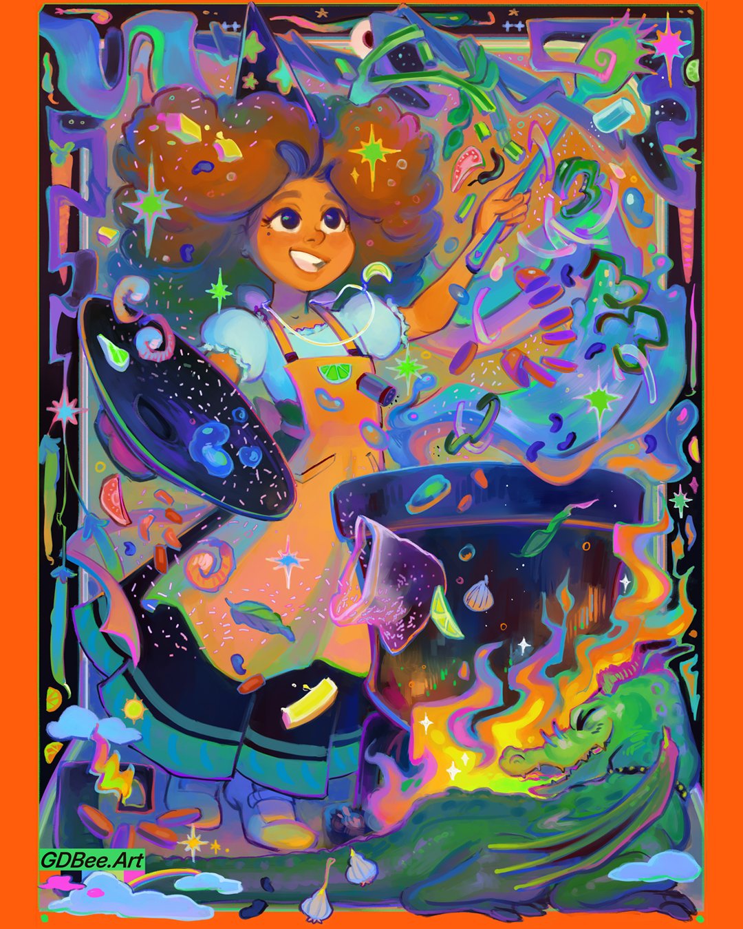 Black concept artist, African American illustrator, Black woman fantasy artist, whimsical digital art, POC character designer, Hugo Award winning artist, GDBee art, diverse children's book illustrator.